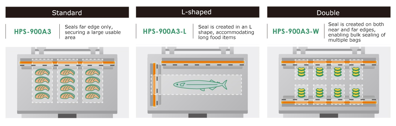 There are three types of seals to choose from: Standard, which seals only the far edge of the chamber space, L-shaped (far edge and left edge), and Double (near and far edges).