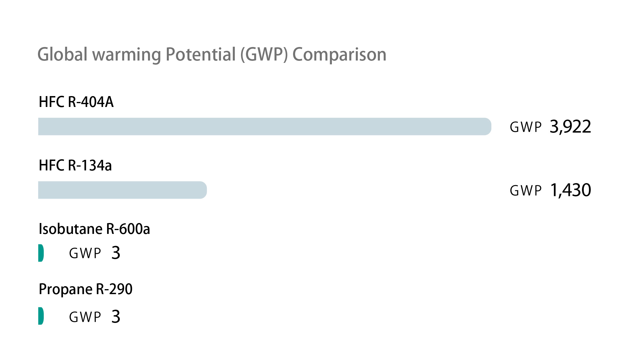 1: Natural refrigerants refer to substances that exist naturally in the environment and are used as refrigerants for refrigeration and air conditioning. These eco-friendly refrigerants have an ozone depletion potential (ODP) of zero and a very low global warming potential (GWP). The GWP is a value indicating the potential of a greenhouse gas to warm the earth when the value for carbon dioxide (CO2) is set at 1. According to the UN Environment Programme (UNEP) OzonAction Kigali Fact Sheet 3 (released in 2017), the GWP for isobutene and propane is 3, while the World Meteorological Organization’s (WMO) Scientific Assessment of Ozone Depletion: 2022 (released in October 2022) puts it at <<1 (significantly less than 1).