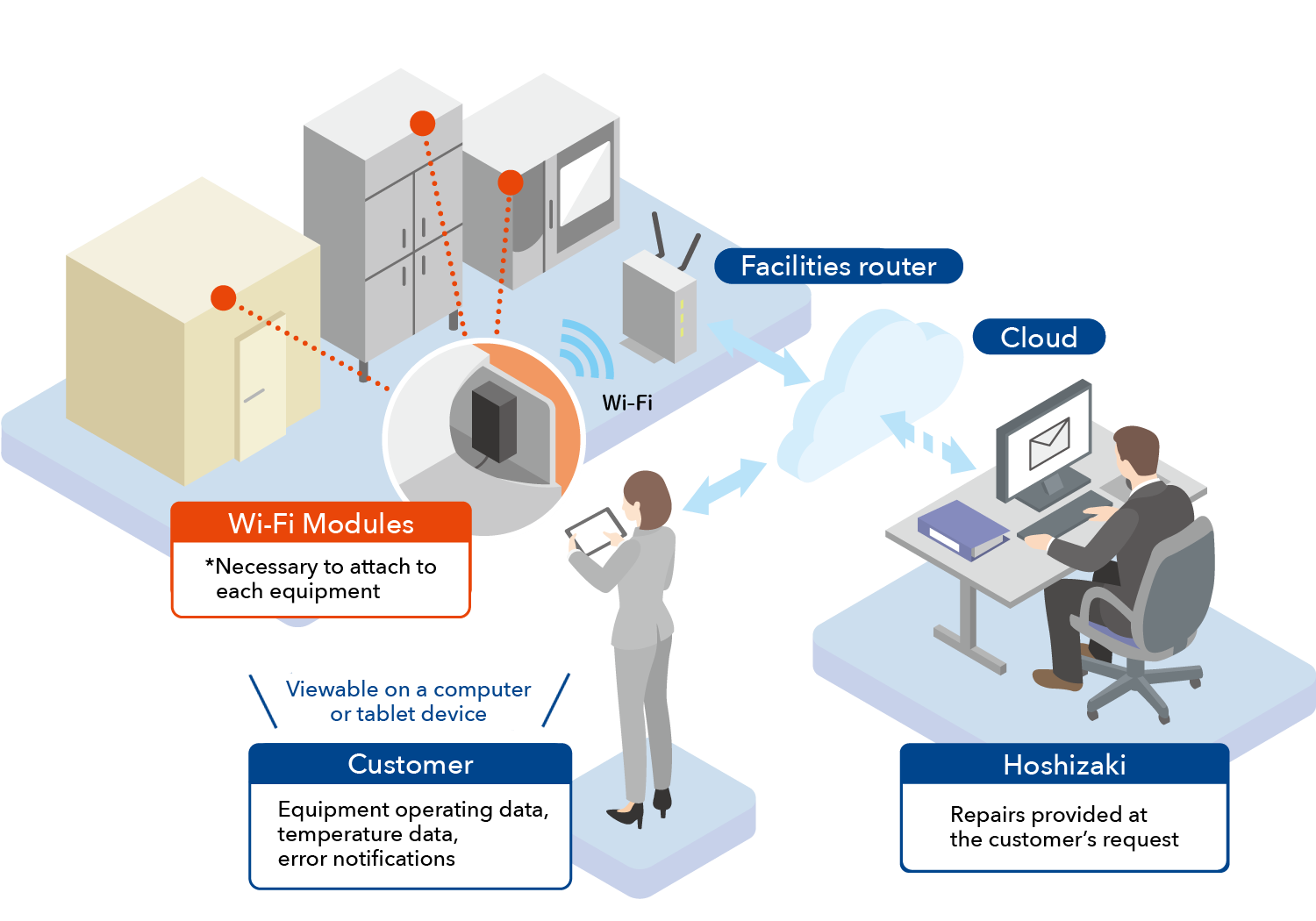 2: As long as the site where the service is to be introduced has a device that can be connected to the internet, and a Wi-Fi environment that does not require a relay, Wi-Fi modules to be installed on Hoshizaki’s equipment eligible for the service are provided and installed free of charge and the first month’s usage fee is waived.