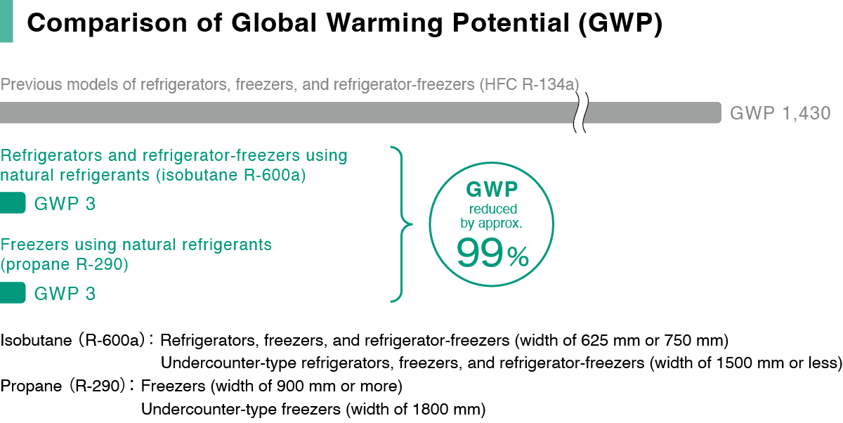 2. Natural refrigerants refer to substances that exist naturally in the environment and are used as refrigerants for freezing and air conditioning. These eco-friendly refrigerants have an ozone depletion potential (ODP) of zero and a very low global warming potential (GWP). The GWP is a value indicating the potential of a greenhouse gas to warm the earth when the value for carbon dioxide (CO2) is set at 1. Hoshizaki uses isobutane (R-600a) and propane (R-290); according to the UN Environment Programme (UNEP) OzonAction Kigali Fact Sheet 3 (released in 2017), the GWP for these substances is 3, while the World Meteorological Organization’s (WMO) Scientific Assessment of Ozone Depletion: 2022 (released in October 2022) puts it at <<1 (significantly less than 1).