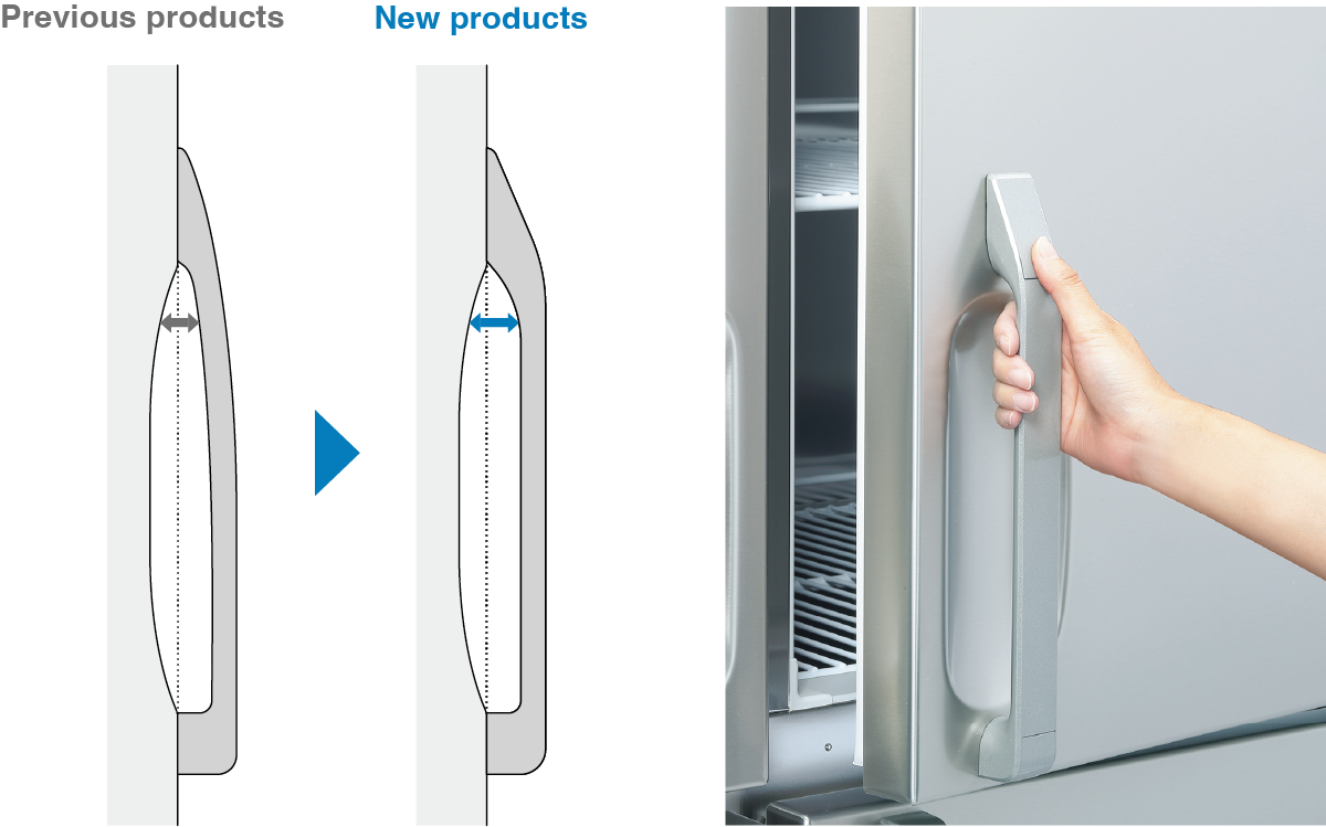 ● To enable smooth opening and closing of doors, Hoshizaki changed the upper section of its door handles from a curved shape to a more rectilinear shape to increase the area available for gripping.