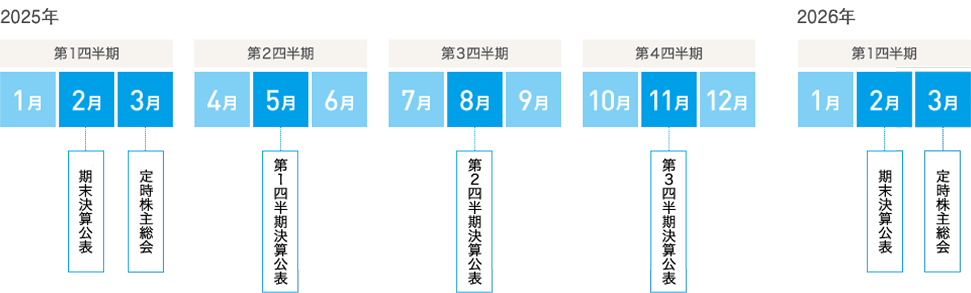 2026年2月13日2025年12月期 決算発表3月第80期定時株主総会5月15日2026年12月期 第1四半期決算発表8月6日2026年12月期 第2四半期決算発表11月12日2026年12月期 第3四半期決算発表2027年2月上旬2026年12月期 決算発表3月第81期定時株主総会※上記日程は予告なく変更する場合がありますので、予めご了承ください。