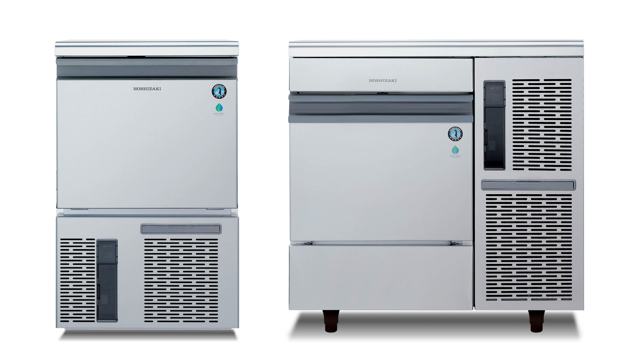 主に飲食店で使用されるアンダーカウンタータイプの業務用製氷機シリーズ。全機種に地球温暖化係数の低いノンフロンの自然冷媒を採用し、環境負荷を大幅に低減しました。製氷室を低温に保つ「保冷制御」で衛生面を改善、前面着脱式フィルターと点検ランプなどによりメンテナンス性を向上させました。